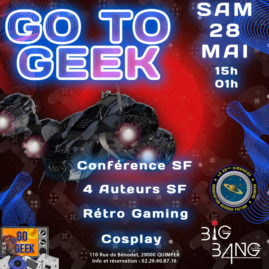 Samedi 28 mai 2022, venez geeker au Big Bang Bar, 110 rue de Bénodet à Quimper, lors de la première édition du Go To Geek convention de Science-Fiction en mode geek ! De 15h jusqu’à la fermeture du bar plusieurs animations seront proposées au public. Expo, auteurs en dédicaces, Atelier SF, table ronde autour de la SF, cosplay et jeux vidéo. Venez découvrir ce nouveau rendez-vous quimpérois sous le signe de la culture Geek et SF.
