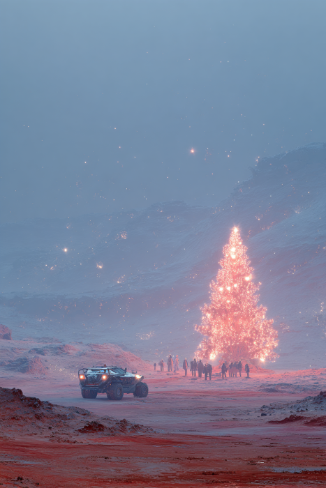 - Noël dans un habitat martien où la neige est remplacée par des tempêtes de poussière rouge.