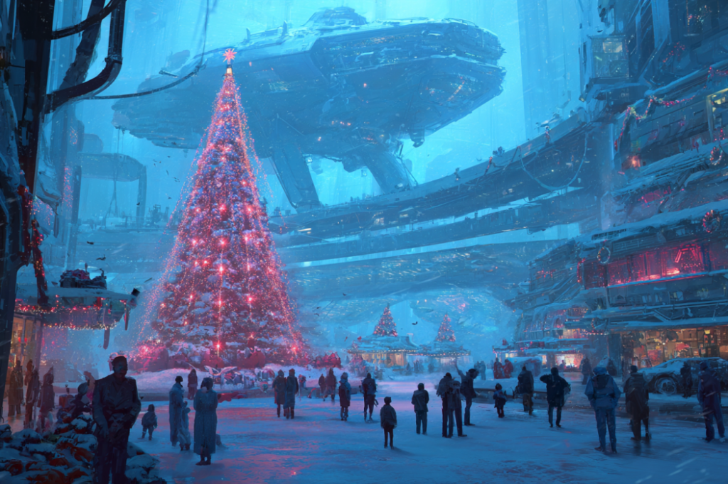 Dans des mondes futuristes où les humains voyagent entre les étoiles, les célébrations hivernales rappellent l’importance de la chaleur, de la communauté, du foyer – qu’importe l’endroit où l’on se trouve.