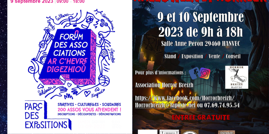 En effet, les 9 et 10 septembre 2023 aura lieu dans le Finistère, et un peu partout en France, les forums d’associations, mais aussi à Hanvec la deuxième édition du Salon Halloween et Horreur.